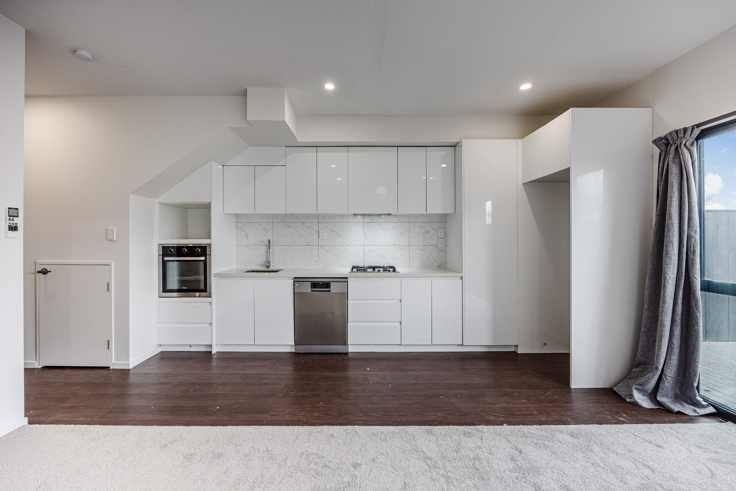 Open-plan living – A light-filled dining area flowing seamlessly into a modern kitchen, complete with dishwasher, rangehood, and cooktop/oven.