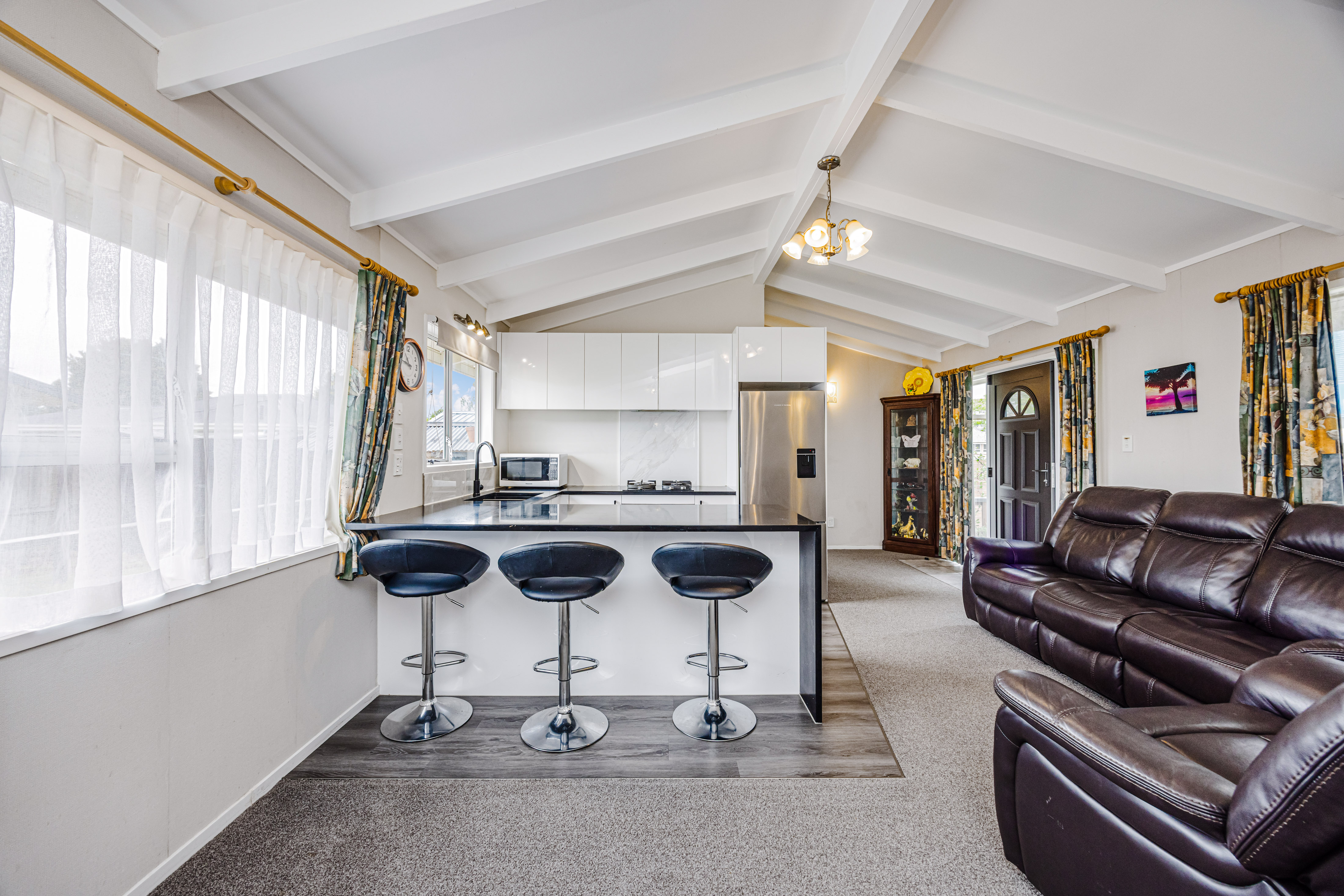 The home features two well-proportioned bedrooms, one bathroom, and a practical kitchen that connects seamlessly with light-filled open-plan living. A heat pump ensures comfort in every season, while an alarm system provides added peace of mind.
